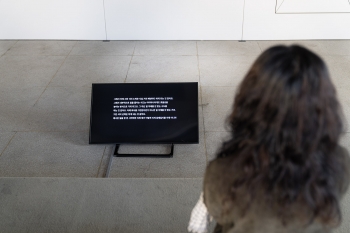3채널 영상 설치, FHD, 흑백, 무음, 32m 8s, 36m 45s, 38m 5s, 반복재생, 프롬프터 브라켓, 모니터, 인쇄된 종이, 가변크기